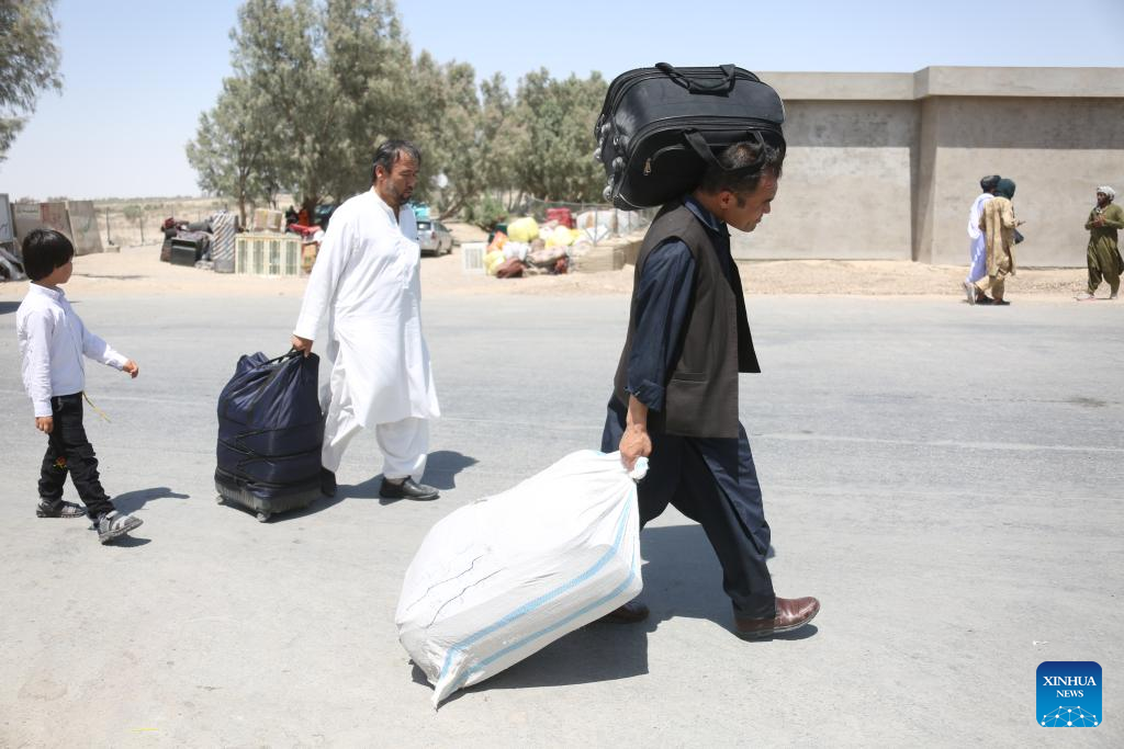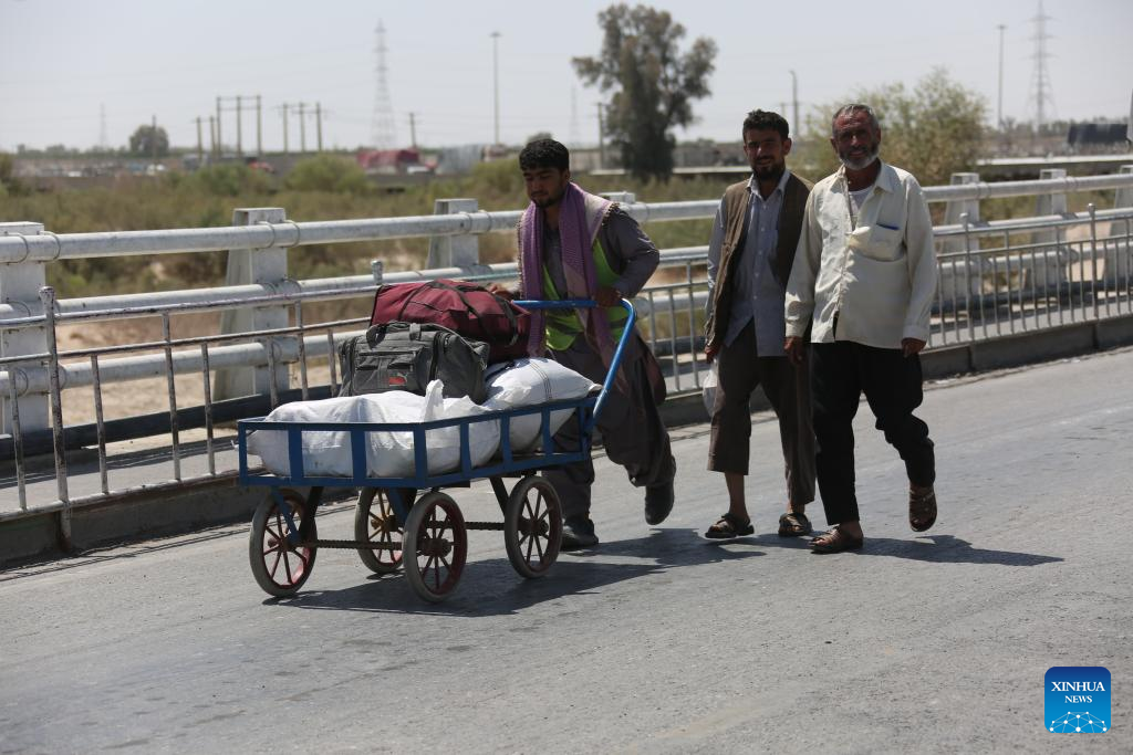 Afghan returnees carry their belongings across the Pul-e-Abresham border crossing in western Nimroz province, Afghanistan, June 17, 2025. (Photo by SaifurahmanSafi/Xinhua)