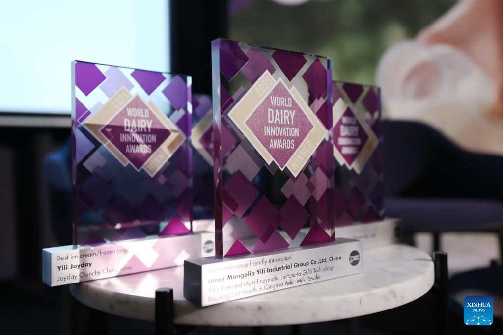 This photo taken on June 18, 2025 shows different categories of the World Dairy Innovation Awards won by China's Yili Group at the 18th Global Dairy Congress in Amsterdam, the Netherlands. Laurence Rycken, director general of the International Dairy Federation (IDF), has praised China's progress in dairy innovation and scientific research, highlighting the complementarity and strong potential for deeper collaboration between the Chinese and European diary industries.(Xinhua/Zhao Dingzhe)