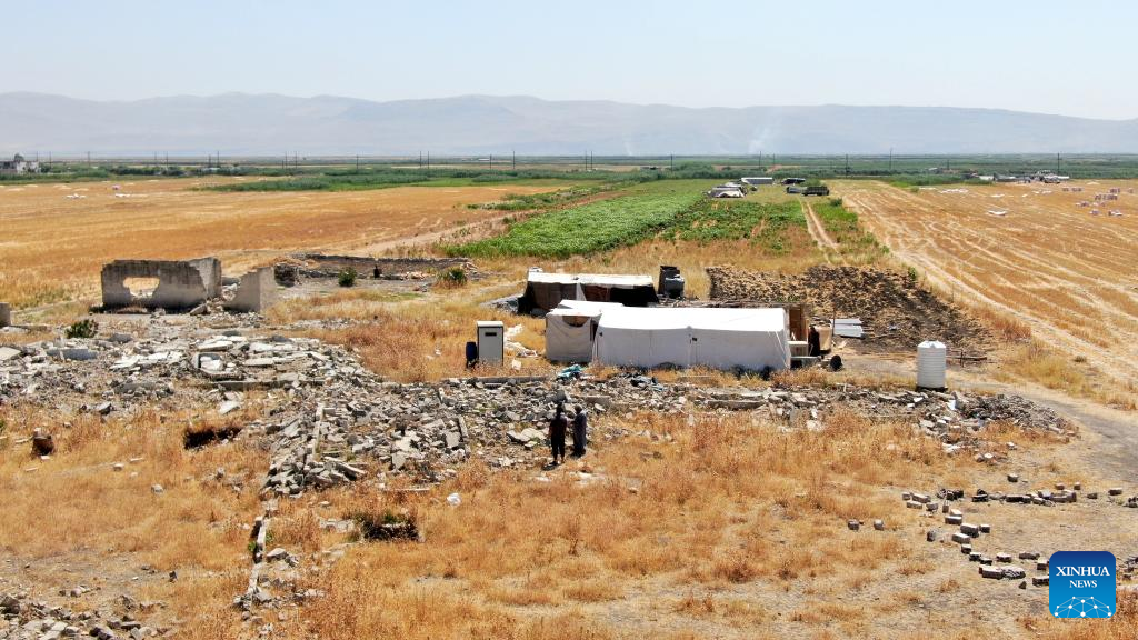 Photo taken on June 19, 2025 shows rubble of a destroyed house and a makeshift tent erected by Akram Mahmoud al-Shehada, a returning Syrian refugee, in Qabr Fiddah, Hama province, central Syria. After 14 years of displacement in Jordan, al-Shehada returned earlier this year to the ruins of his village, Qabr Fiddah, near Qalaat al-Madiq in Syria's central Hama province. His stone house, built brick by brick over decades of labor, was flattened during the war. Yet instead of despair, he chose to stay and start over. (Str/Xinhua)