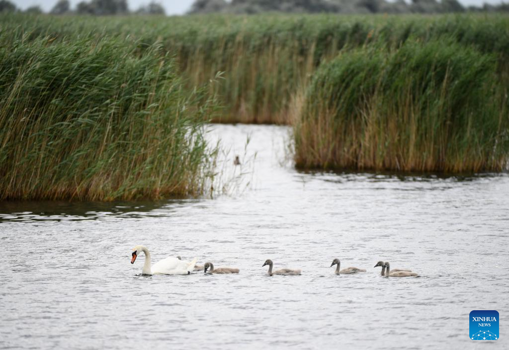 This photo taken on June 17, 2025 shows mute swans at the Neusiedler See-Seewinkel National Park in Austria. (Xinhua/He Canling)