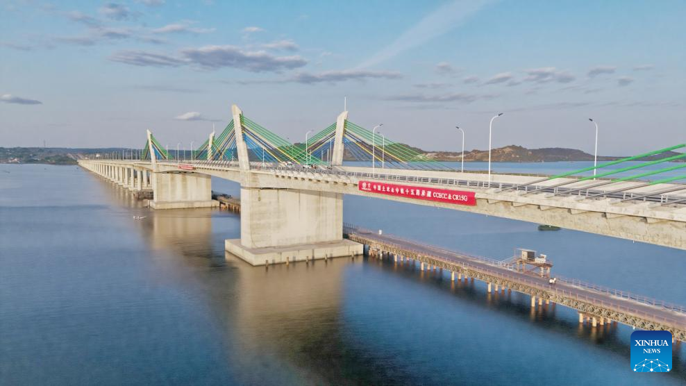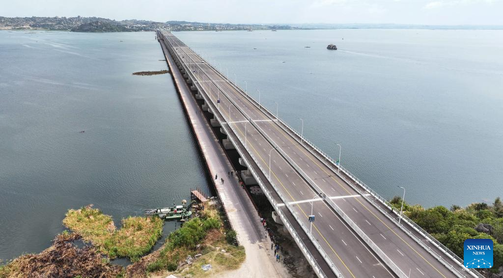 An aerial drone photo taken on June 19, 2025 shows the Chinese-built Magufuli Bridge in Mwanza, Tanzania. (China Civil Engineering Construction Corporation/Handout via Xinhua)