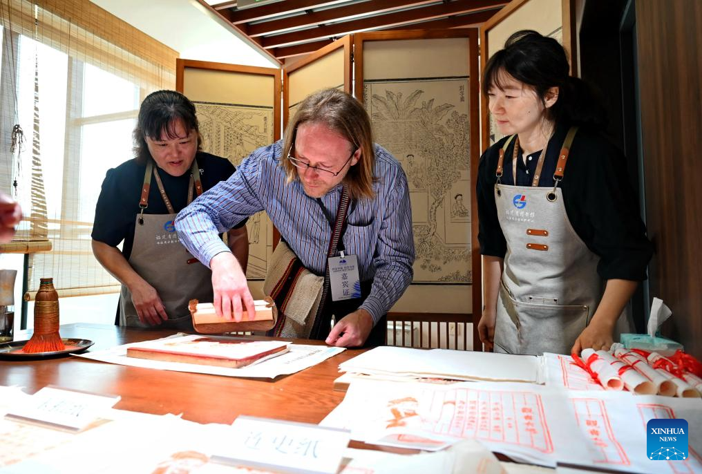 A librarian participating in an exchange program tries woodblock printing at the Fujian Provincial Library in Fuzhou, southeast China's Fujian Province, June 21, 2025. Participants of the event visited the innovative reading spaces of Fujian Provincial Library on Saturday to experience the achievements of local public cultural services. A seminar was also held to discuss cultural heritage and the sustainable development of libraries. (Xinhua/Lin Shanchuan)