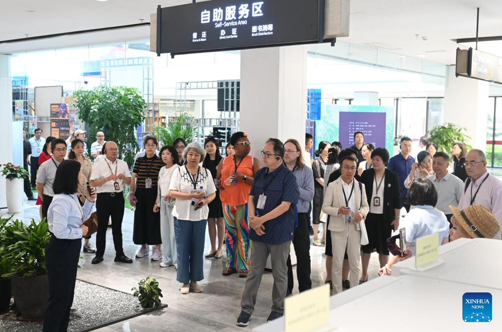 Librarians from China and abroad participating in an exchange program visit the self-service area of Fujian Provincial Library in Fuzhou, southeast China's Fujian Province, June 21, 2025. Participants of the event visited the innovative reading spaces of Fujian Provincial Library on Saturday to experience the achievements of local public cultural services. A seminar was also held to discuss cultural heritage and the sustainable development of libraries. (Xinhua/Lin Shanchuan)