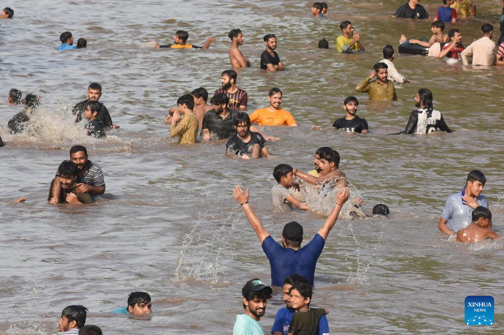 People cool off themselves during a heat wave in a canal in Lahore, Pakistan on June 20, 2025. Temperature reached over 40 degrees Celsius in many cities of Pakistan. (Photo by Sajjad/Xinhua)
