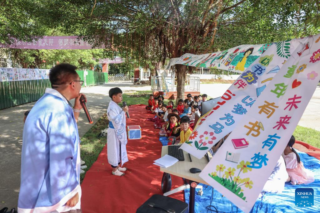 Students participate in a fairy tale music festival in the Experimental Primary School in Hanlin Town of Ding'an County, south China's Hainan Province, June 20, 2025. Teachers in the school organized role-playing activities and interactive discussions to generate students' enthusiasm for reading. (Xinhua/Zhang Liyun)