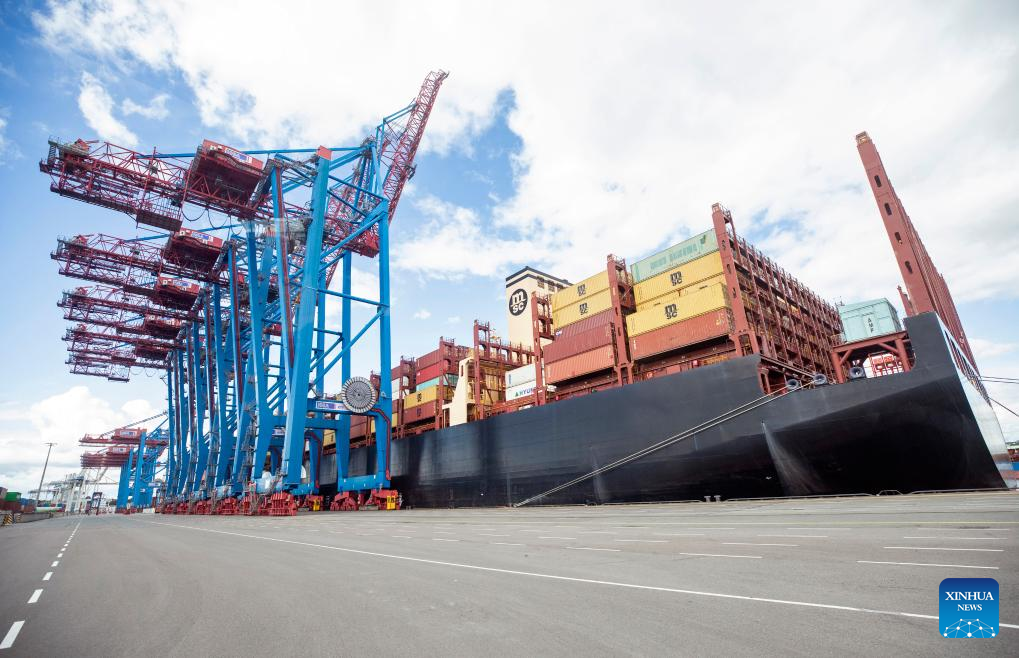 This photo taken on May 28, 2025 shows a container ship at the Container Terminal Tollerort in Hamburg, Germany. (Xinhua/Zhang Fan)