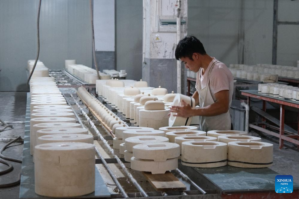 A staff member operates at a workshop of Dehua Huamao Ceramics Co., Ltd. in Dehua County of southeast China's Fujian Province, June 10, 2025.(Xinhua/Li Jiacong)