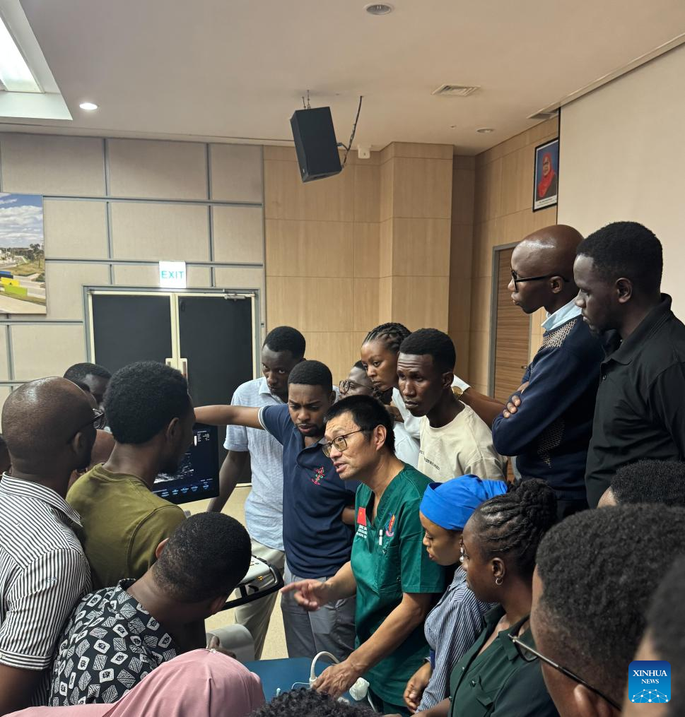 Zhang Junqiao (C) gives a lecture to local medical students at Muhimbili National Hospital in Dar es Salaam, Tanzania, May 25, 2025. (Xinhua)