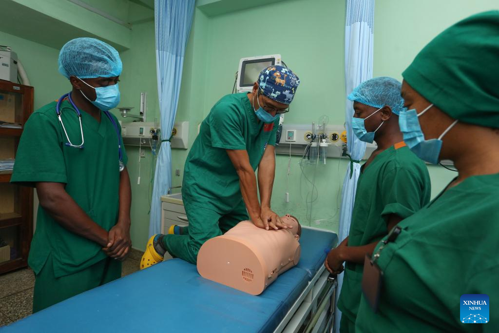 Zhang Junqiao (2nd L) demonstrates cardiopulmonary resuscitation (CPR) at Muhimbili National Hospital in Dar es Salaam, Tanzania, May 9, 2025. (Xinhua/Emmanuel Herman)