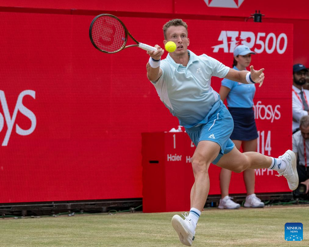 Jiri Lehecka returns a shot during the men's singles final between Carlos Alcaraz of Spain and Jiri Lehecka of the Czech Republic at the Queen's Club Championships in London, Britain, on June 22, 2025. (Photo by Stephen Chung/Xinhua)