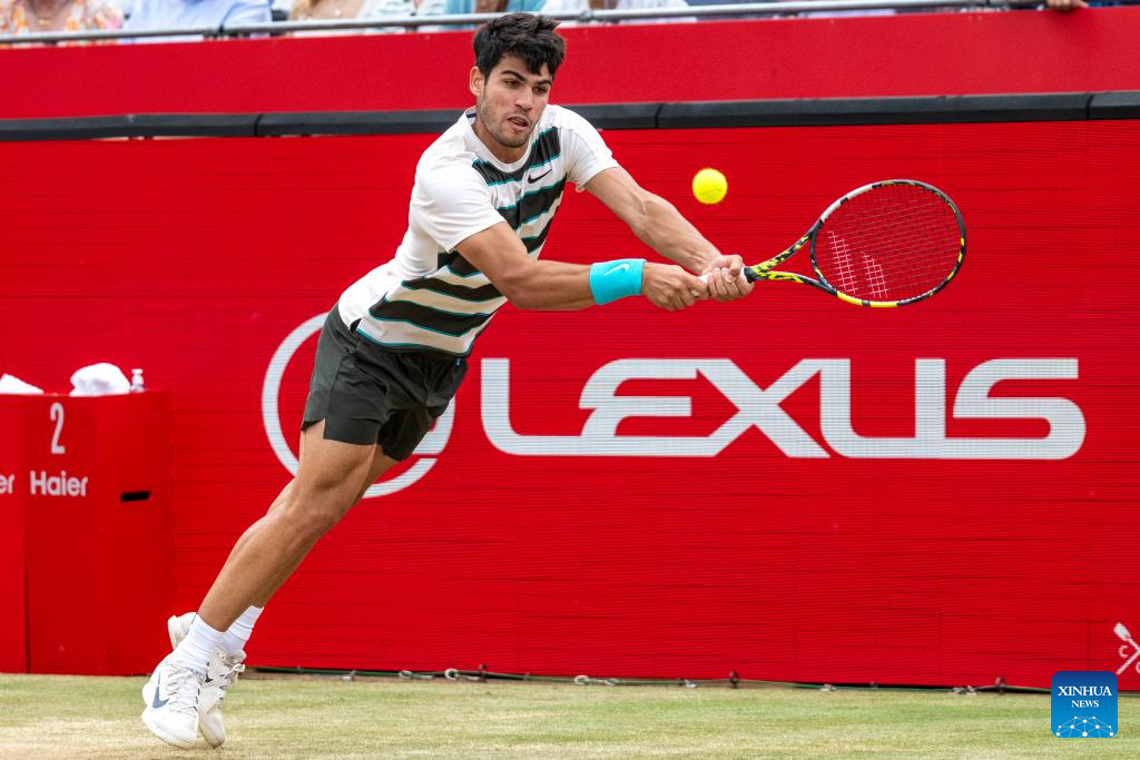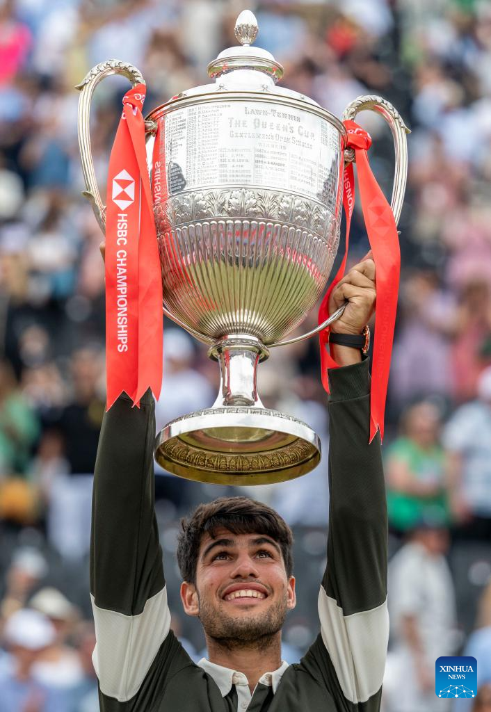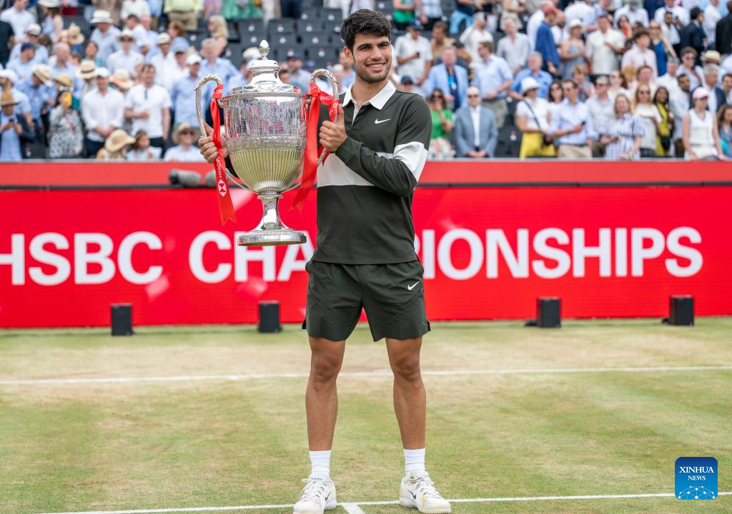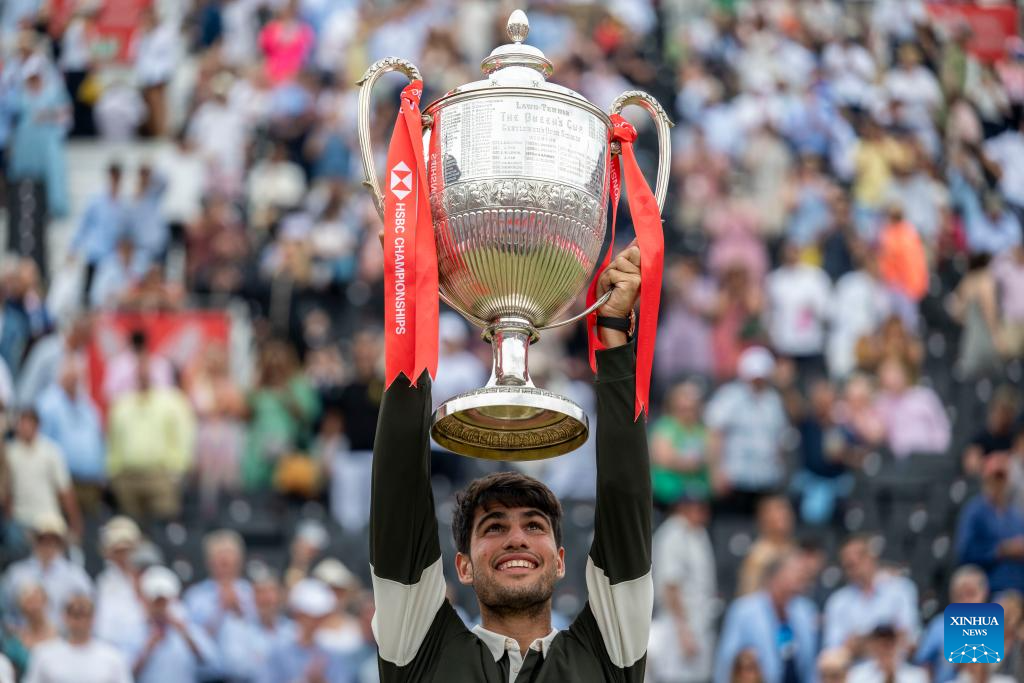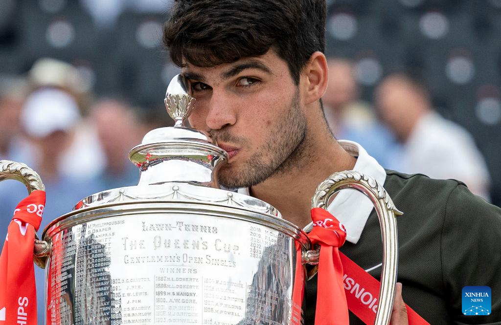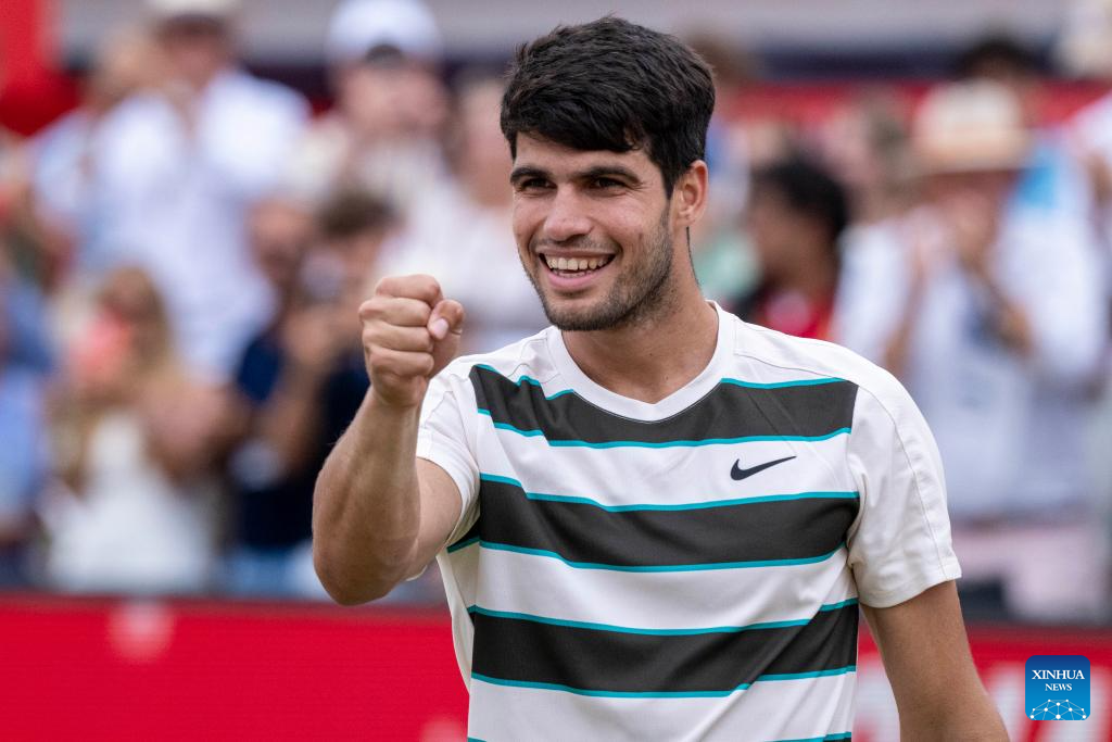 LONDON, June 22 (Xinhua) -- Top seed Carlos Alcaraz defeated Czech hopeful Jiri Lehecka 7-5, 6-7(5), 6-2 to claim the title at the Queen's Club Championships on Sunday.