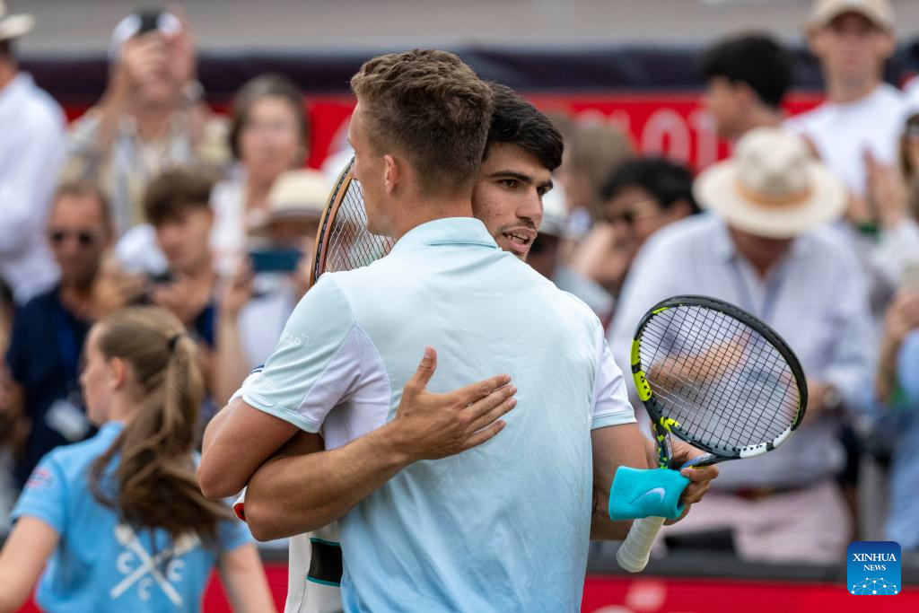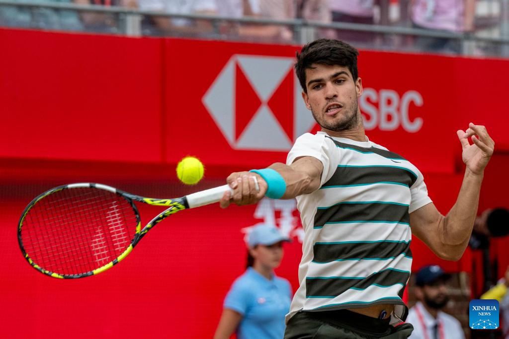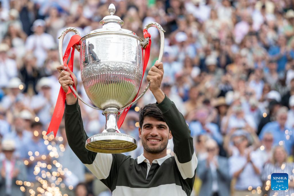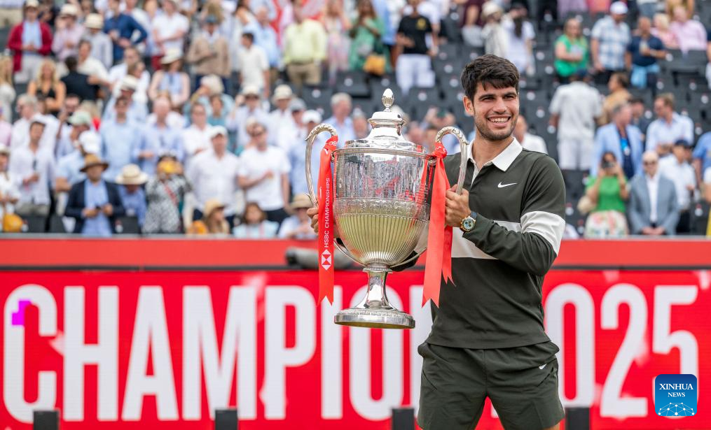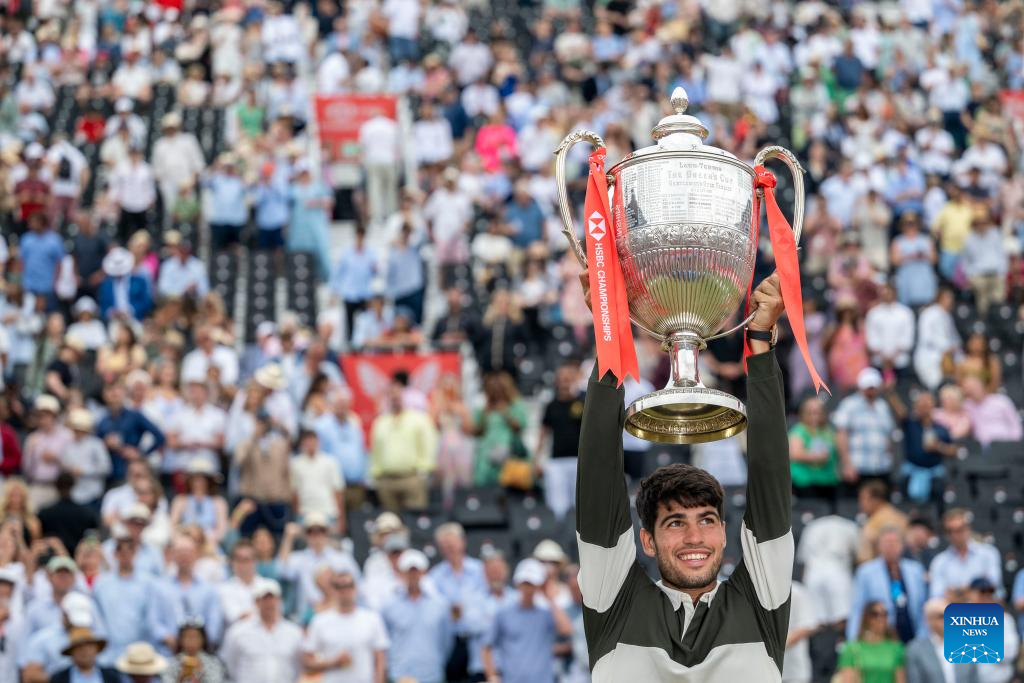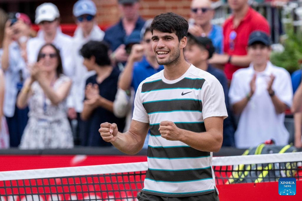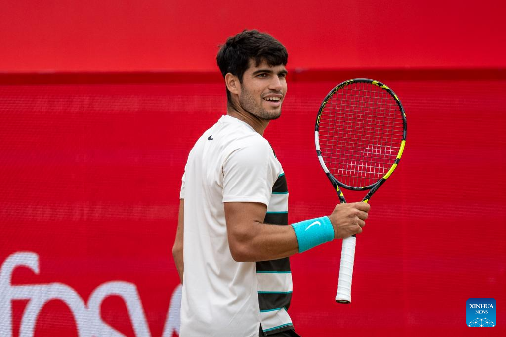 LONDON, June 22 (Xinhua) -- Top seed Carlos Alcaraz defeated Czech hopeful Jiri Lehecka 7-5, 6-7(5), 6-2 to claim the title at the Queen's Club Championships on Sunday.