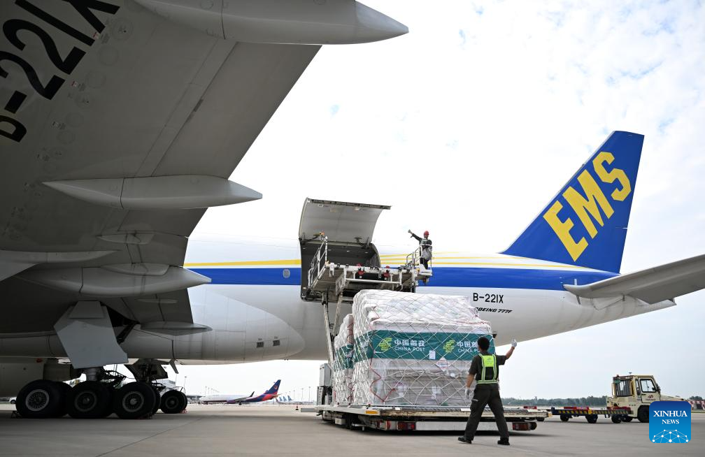 This photo taken on June 23, 2025 shows cargo ready for loading onto a plane of China Postal Airlines from China's Zhengzhou to Luxembourg at Zhengzhou Xinzheng International Airport in Zhengzhou, central China's Henan Province.