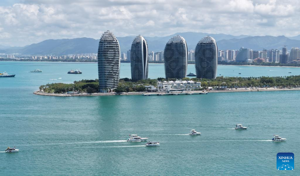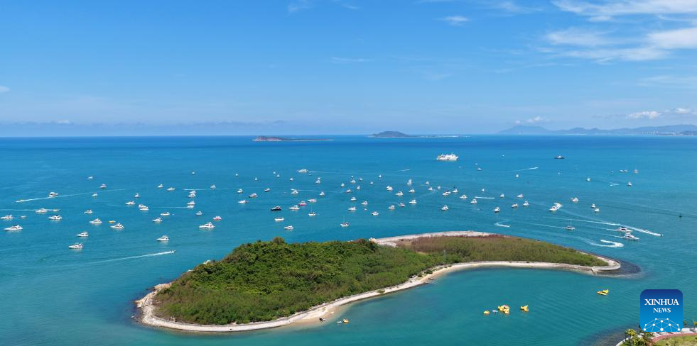 An aerial drone photo shows tourists taking yachts to have fun in Sanya, south China's Hainan Province, June 24, 2025. As the 2025 summer travel peak season approaches, the waters in Sanya have gathered a variety of yachts, attracting many domestic and international tourists to experience yacht excursions, and enjoy the vibrant energy and refreshing coolness of the coastal city. (Xinhua/Zhao Yingquan)