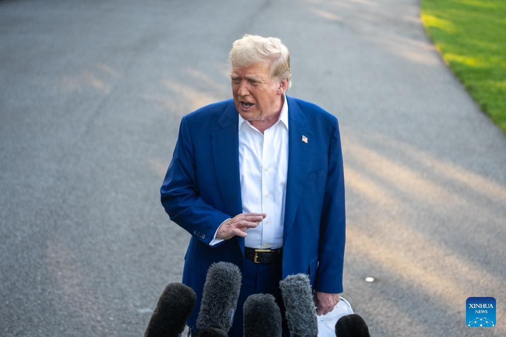 U.S. President Donald Trump takes questions from the press on the South Lawn of the White House in Washington, D.C., the United States, June 24, 2025. U.S. President Donald Trump, who announced Monday that Israel and Iran have reached a formal agreement to implement a complete and total ceasefire, criticized both sides for breaching the truce and urged Israel to show restraint. "They both violated the ceasefire," Trump said as he departed the White House (Xinhua/Hu Yousong)