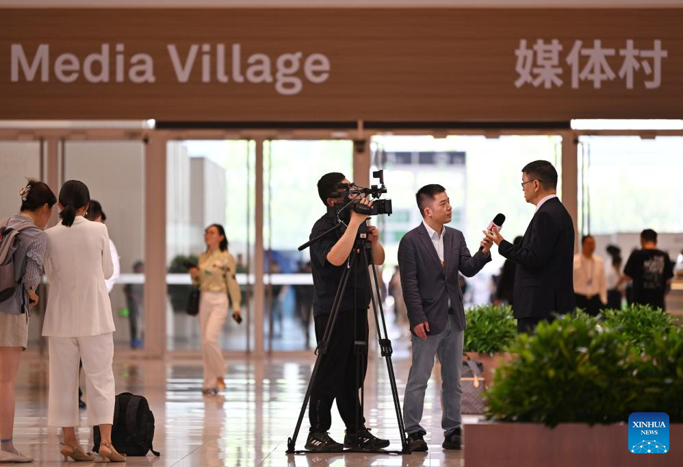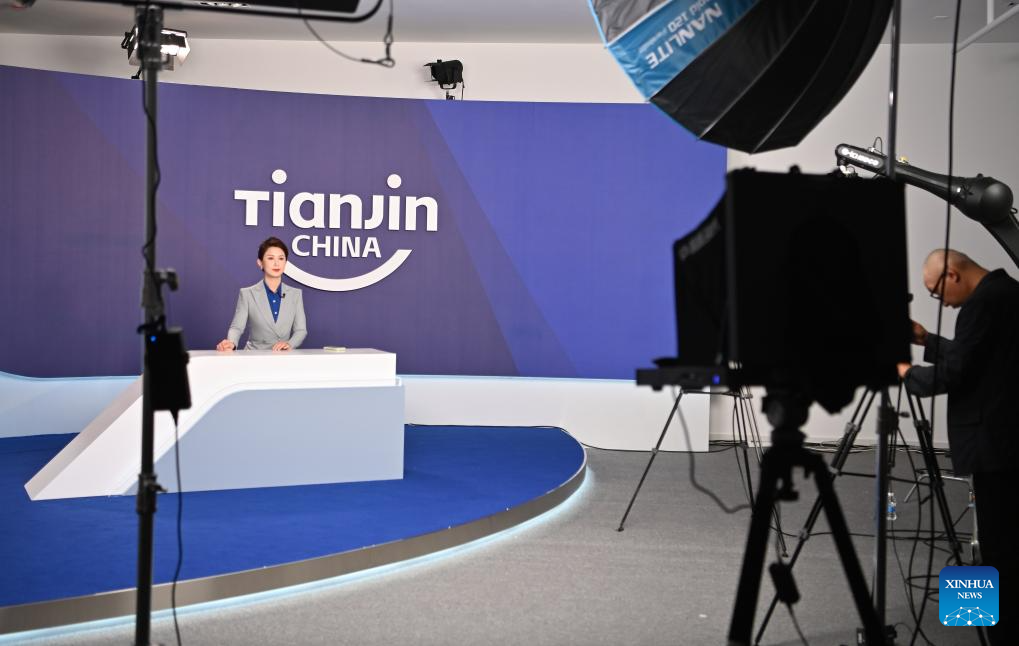 A news anchor works at the Media Village inside the National Convention and Exhibition Center (Tianjin) in north China's Tianjin Municipality, June 24, 2025. The Media Village of the 2025 Summer Davos forum was open to the public here on Tuesday. Also known as the 16th Annual Meeting of New Champions of the World Economic Forum and held from June 24 to 26, this year's Summer Davos forum is themed "Entrepreneurship in the New Era" and is expected to bring together around 1,800 participants from over 90 countries and regions. (Xinhua/Li Ran)