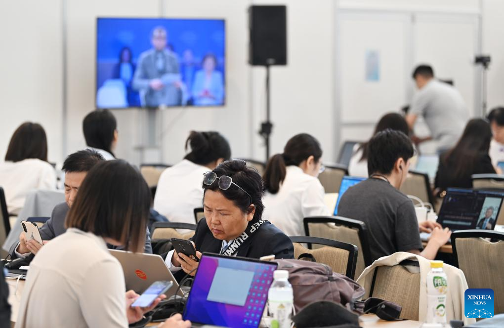 Journalists work at the Media Village inside the National Convention and Exhibition Center (Tianjin) in north China's Tianjin Municipality, June 24, 2025. The Media Village of the 2025 Summer Davos forum was open to the public here on Tuesday. Also known as the 16th Annual Meeting of New Champions of the World Economic Forum and held from June 24 to 26, this year's Summer Davos forum is themed "Entrepreneurship in the New Era" and is expected to bring together around 1,800 participants from over 90 countries and regions. (Xinhua/Li Ran)