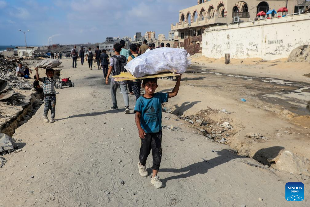 A Palestinian child carries a bag of collected firewood at a temporary shelter amid a long-time shortage of cooking gas and fuel in northern Gaza City, on June 24, 2025. (Photo by Rizek Abdeljawad/Xinhua)
