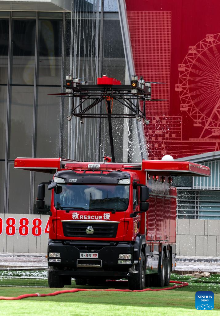 A fire engine with a drone is parked at the site of a fire drill for a high-rise building in Shenzhen, south China's Guangdong Province, June 24, 2025. A high-rise building fire drill aimed at testing the efficiency of high-tech firefighting methods and improving response time was held here on Tuesday. (Xinhua/Mao Siqian)