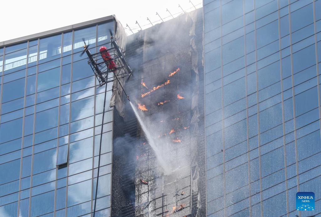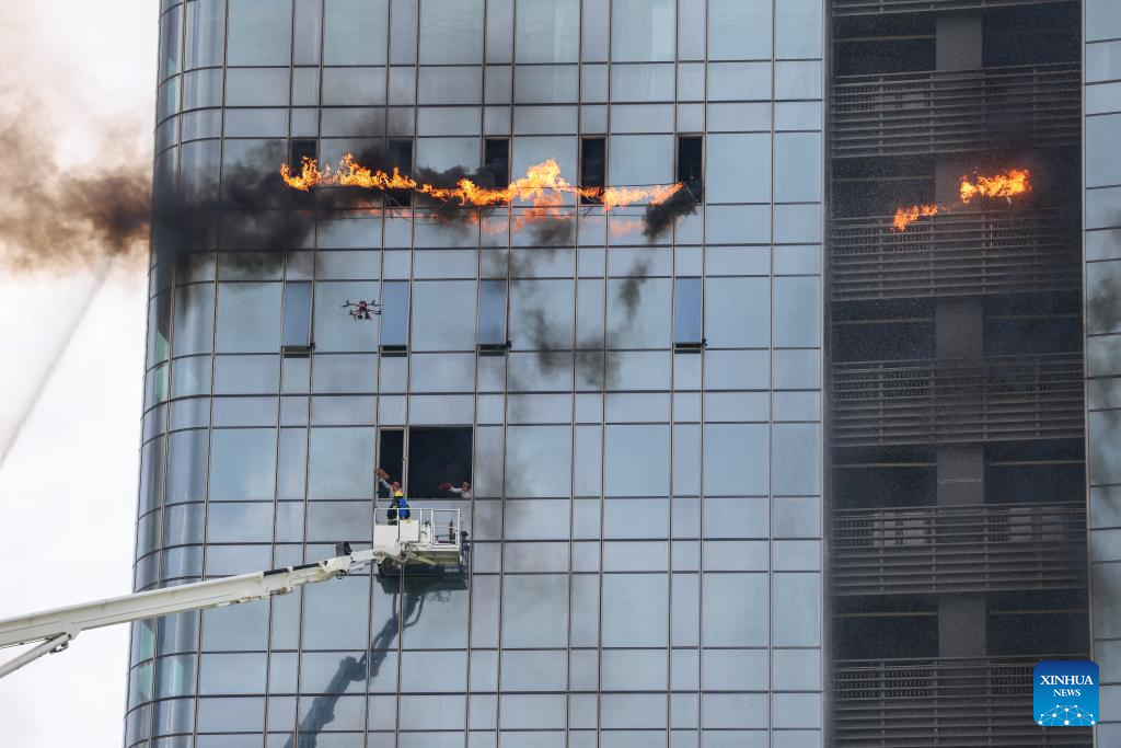 A fire drill for a high-rise building is carried out in Shenzhen, south China's Guangdong Province, June 24, 2025. A high-rise building fire drill aimed at testing the efficiency of high-tech firefighting methods and improving response time was held here on Tuesday. (Xinhua/Mao Siqian)