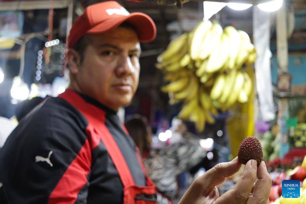 A vendor displays a lychee for sale at a market stall in Mexico City, capital of Mexico, June 24, 2025. (Photo by Francisco Canedo/Xinhua)