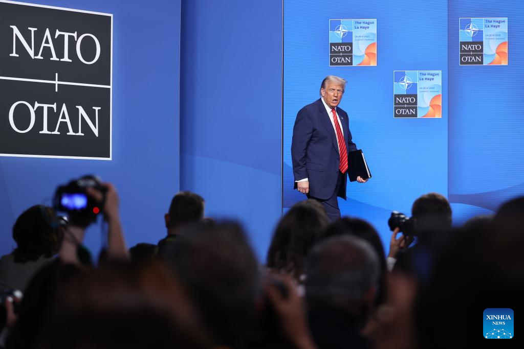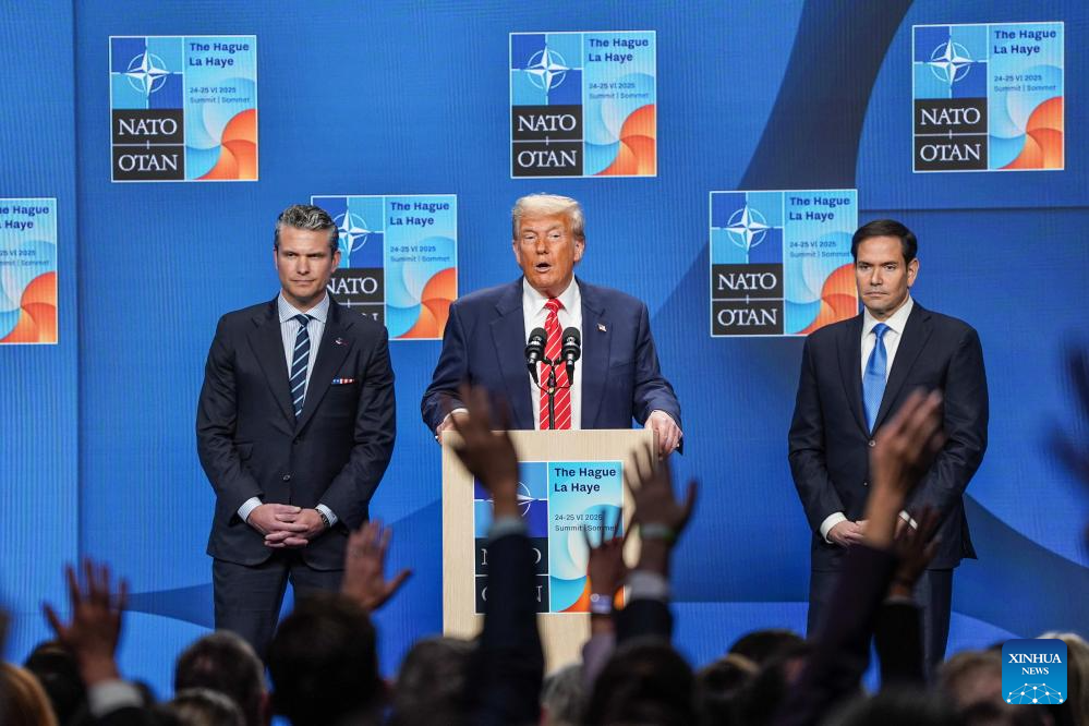 U.S. President Donald Trump (C) attends a press conference following the NATO summit in The Hague, the Netherlands, on June 25, 2025. Trump said here on Wednesday that the United States will hold talks with Iran next week. (Xinhua/Zhao Dingzhe)