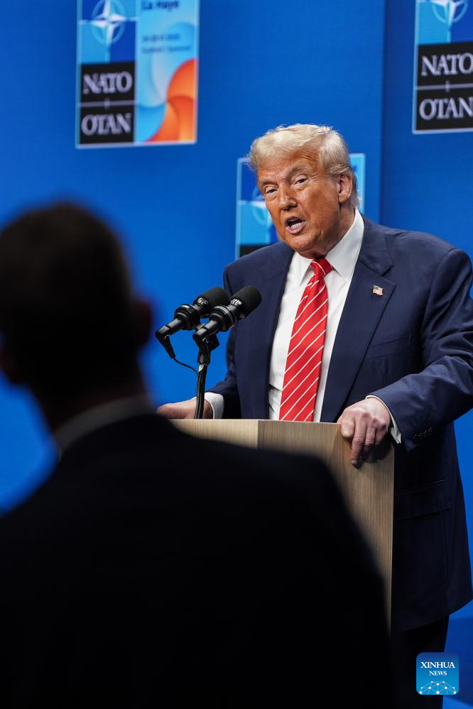 U.S. President Donald Trump attends a press conference following the NATO summit in The Hague, the Netherlands, on June 25, 2025. Trump said here on Wednesday that the United States will hold talks with Iran next week. (Xinhua/Zhao Dingzhe)