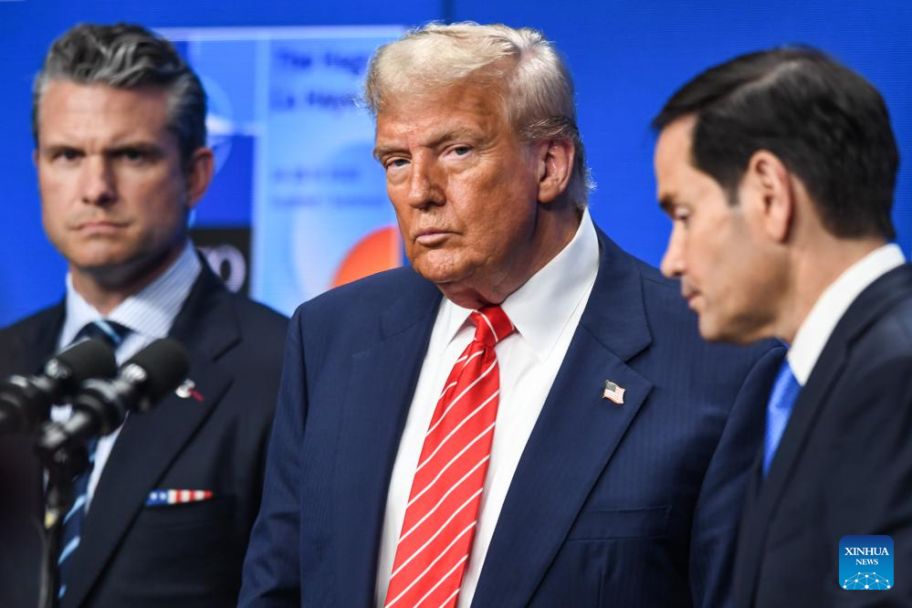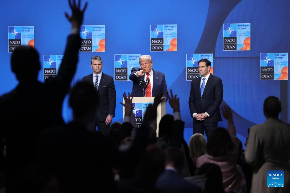 U.S. President Donald Trump (C) attends a press conference following the NATO summit in The Hague, the Netherlands, on June 25, 2025. Trump said here on Wednesday that the United States will hold talks with Iran next week. (Xinhua/Peng Ziyang)