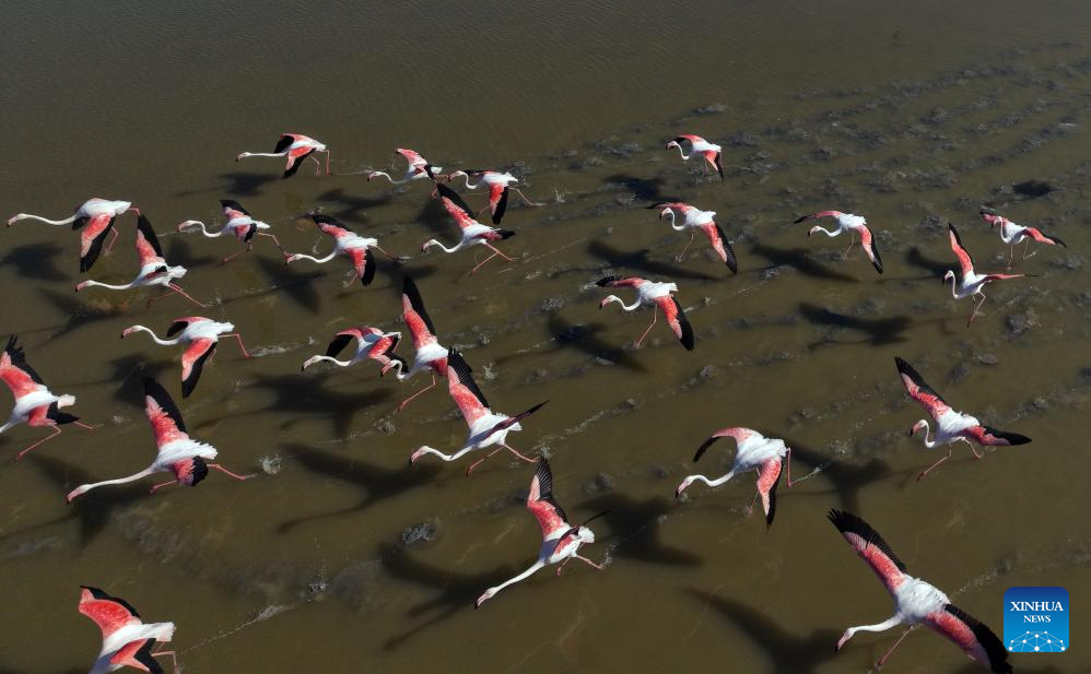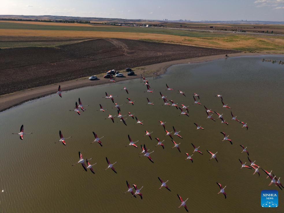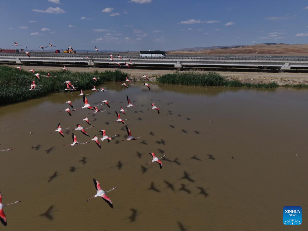 A flamboyance of flamingos are seen over Mogan Lake in Ankara, Türkiye, on June 25, 2025. (Mustafa Kaya/Handout via Xinhua)