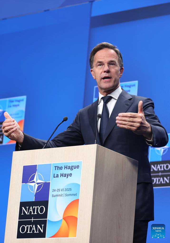 North Atlantic Treaty Organization (NATO) Secretary General Mark Rutte attends a press conference during the NATO summit in The Hague, the Netherlands, June 25, 2025. Member states of the NATO have agreed to raise their defense spending to 5 percent of gross domestic product (GDP) annually by 2035, according to a declaration issued on Wednesday following the high-level summit in The Hague. (Xinhua/Zhao Dingzhe)