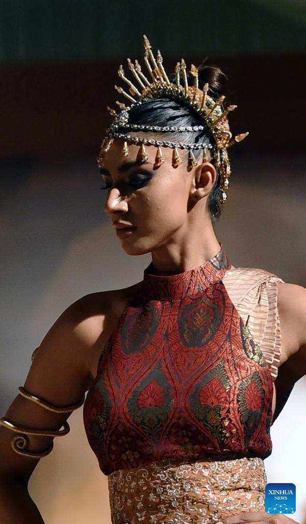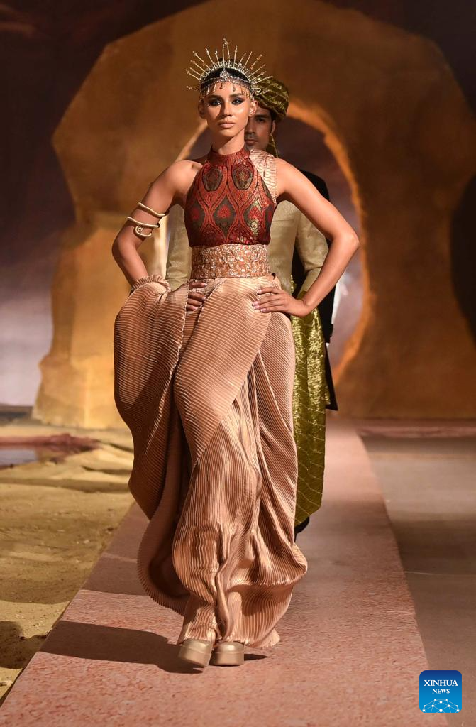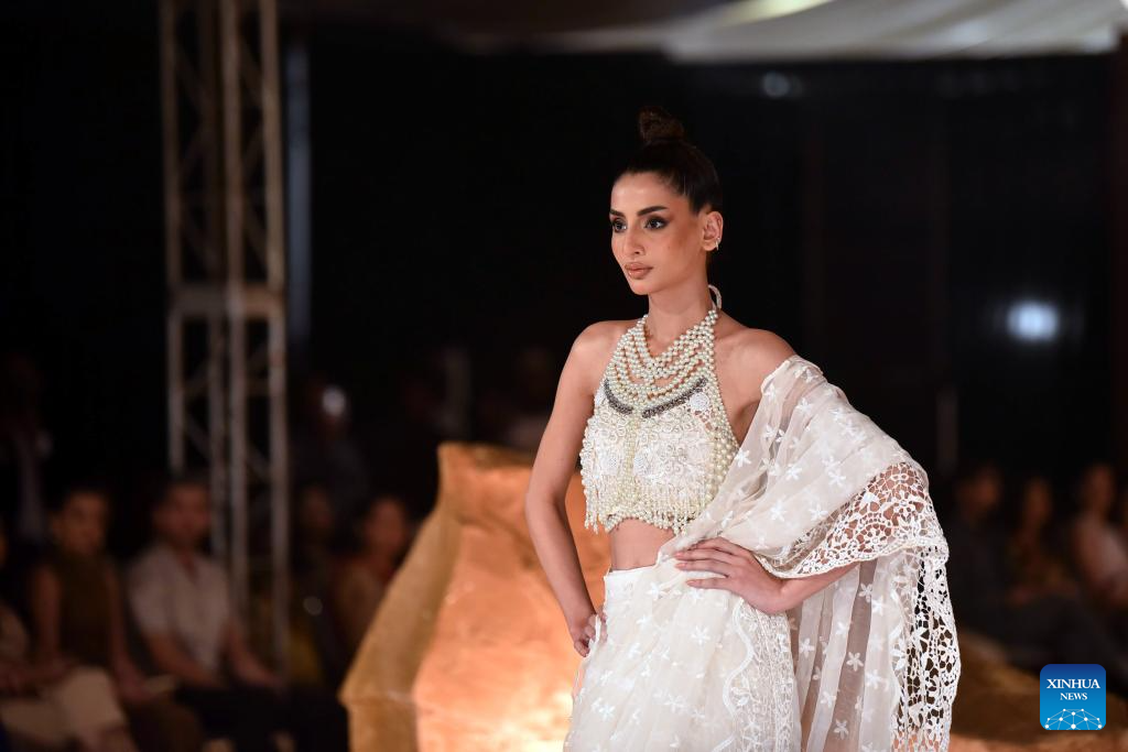 A model presents a creation during a fashion show in Karachi, southern Pakistan, on June 25, 2025. (Str/Xinhua)