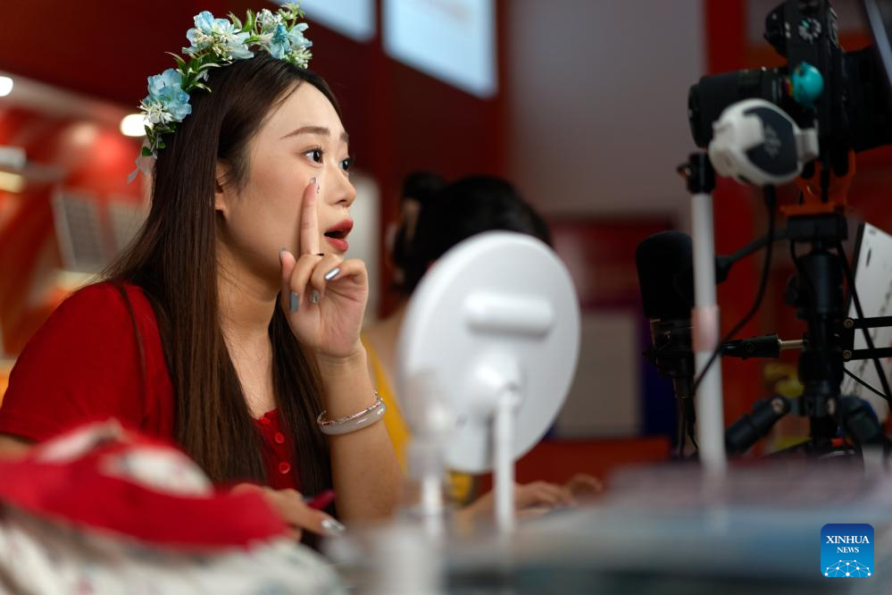 A host introduces false eyelash products via live-streaming at an industrial park for beauty economy in Pingdu City, Qingdao of east China's Shandong Province, June 24, 2025. Development of the false eyelash industry in Pingdu began in the 1970s. Nowadays, over 5,000 business entities and about 60,000 employees are involved in the local pillar industry. Every year, about 120 million pairs of false eyelashes produced in Pingdu are sold overseas, bringing an annual output value of about 10 billion yuan (about 1.4 billion U.S. dollars).