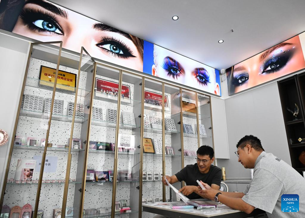 Merchants negotiate at a shop of an industrial park for beauty economy in Pingdu City, Qingdao of east China's Shandong Province, June 24, 2025. Development of the false eyelash industry in Pingdu began in the 1970s. Nowadays, over 5,000 business entities and about 60,000 employees are involved in the local pillar industry. Every year, about 120 million pairs of false eyelashes produced in Pingdu are sold overseas, bringing an annual output value of about 10 billion yuan (about 1.4 billion U.S. dollars).