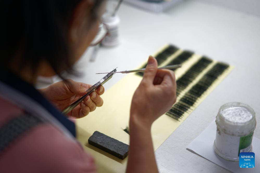 A worker applies glue onto eyelashes at a false eyelash production base in Pingdu City, Qingdao of east China's Shandong Province, June 25, 2025. Development of the false eyelash industry in Pingdu began in the 1970s. Nowadays, over 5,000 business entities and about 60,000 employees are involved in the local pillar industry. Every year, about 120 million pairs of false eyelashes produced in Pingdu are sold overseas, bringing an annual output value of about 10 billion yuan (about 1.4 billion U.S. dollars).