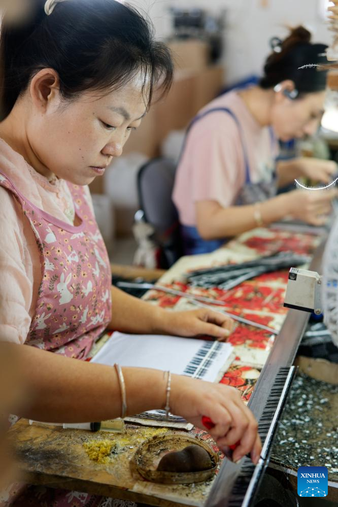 Workers are seen at a false eyelash production base in Pingdu City, Qingdao of east China's Shandong Province, June 25, 2025. Development of the false eyelash industry in Pingdu began in the 1970s. Nowadays, over 5,000 business entities and about 60,000 employees are involved in the local pillar industry. Every year, about 120 million pairs of false eyelashes produced in Pingdu are sold overseas, bringing an annual output value of about 10 billion yuan (about 1.4 billion U.S. dollars).
