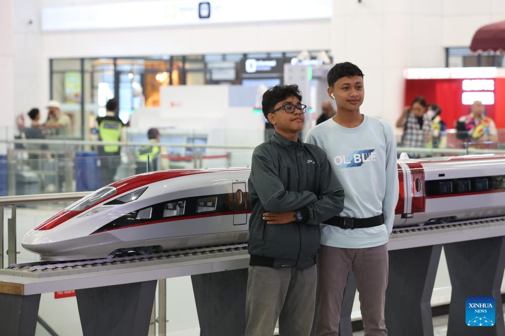 Passengers pose for photos with a model of a high-speed electrical multiple unit (EMU) train of the Jakarta-Bandung high-speed railway at the waiting hall of Halim Station in Jakarta, Indonesia, June 19, 2025. The Jakarta-Bandung High-Speed Railway (HSR) has transported more than 10 million passengers as of Wednesday since it began operations on Oct. 17, 2023, PT Kereta Cepat Indonesia-China (KCIC), a joint venture consortium between Indonesian and Chinese firms that constructs and operates the railway announced on Thursday. (Xinhua/Cen Yunpeng)