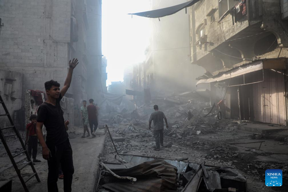 Palestinians are seen among the rubble of destroyed buildings after an Israeli airstrike in Gaza City, on June 27, 2025. At least 40 Palestinians were killed by Israeli gunfire and shelling across the Gaza Strip on Friday, Palestinian sources said. (Photo by Rizek Abdeljawad/Xinhua)