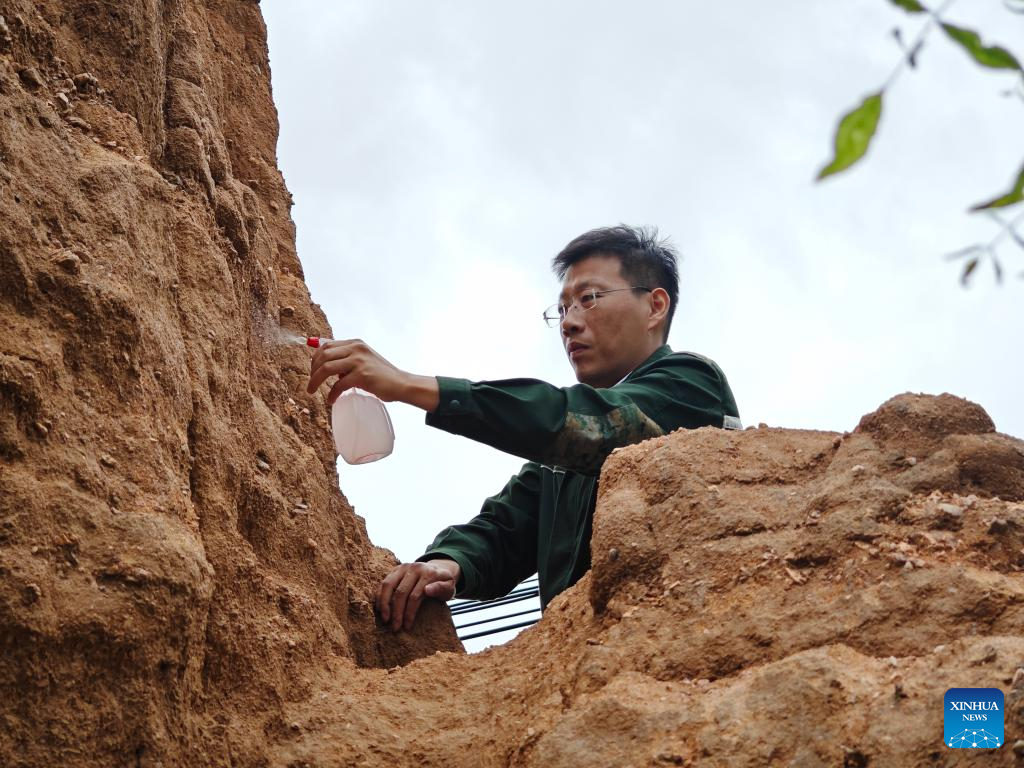 This photo taken by a mobile phone on June 16, 2025 shows Liu Liang, head of a research team, applying biological conservation methods to protect a section of the Great Wall from rain erosion in Qinhuangdao City, north China's Hebei Province, June 16, 2025. (Xinhua/Bai Lin)