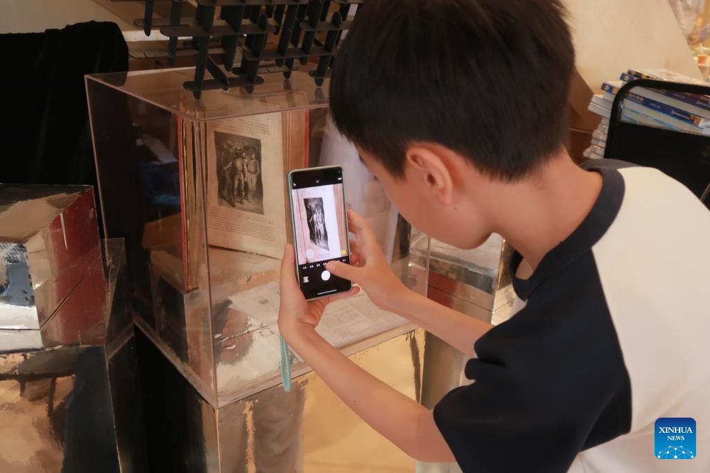 A boy takes a photo of the first illustrated French edition of "Twenty Thousand Leagues Under the Sea" by Jules Verne during a science fiction classic exhibition in Beijing, capital of China, June 22, 2025. (Xinhua/Shi Yifei)