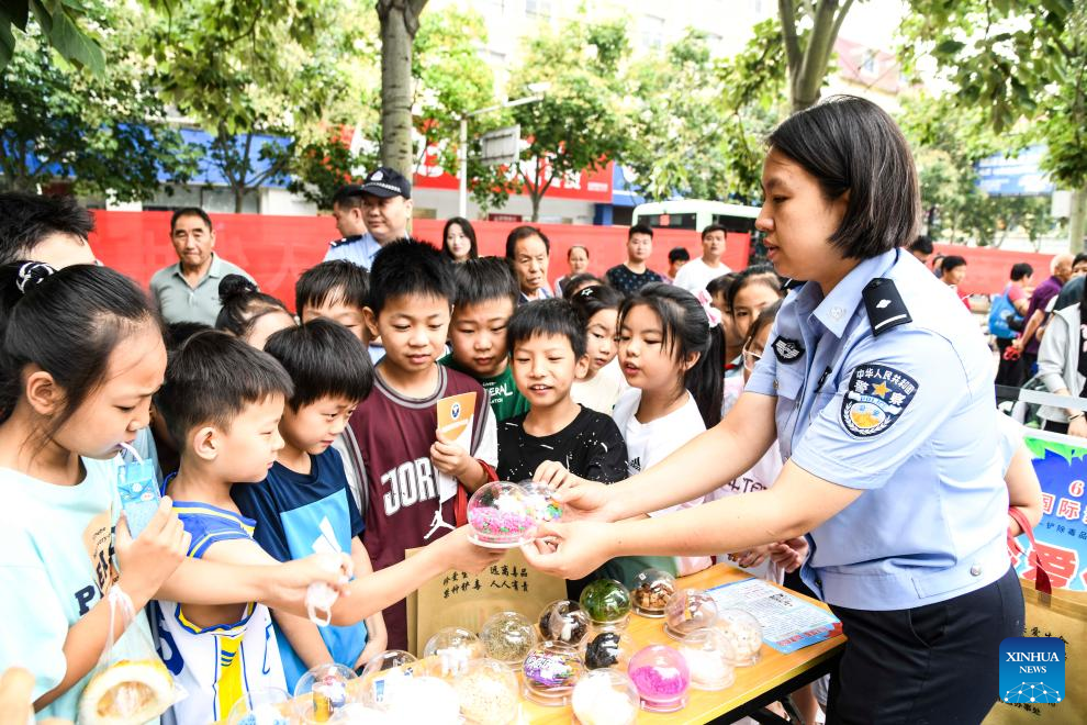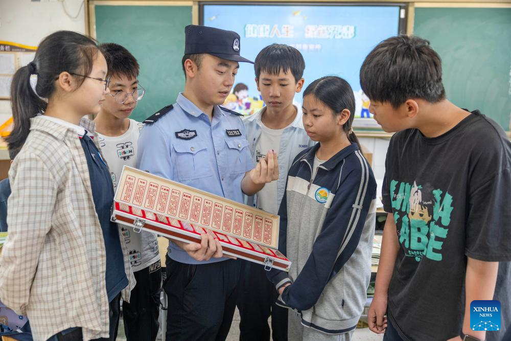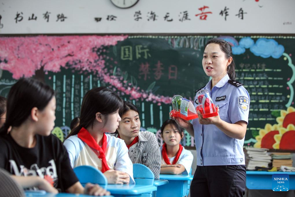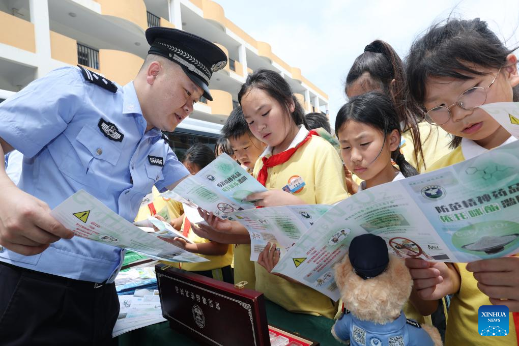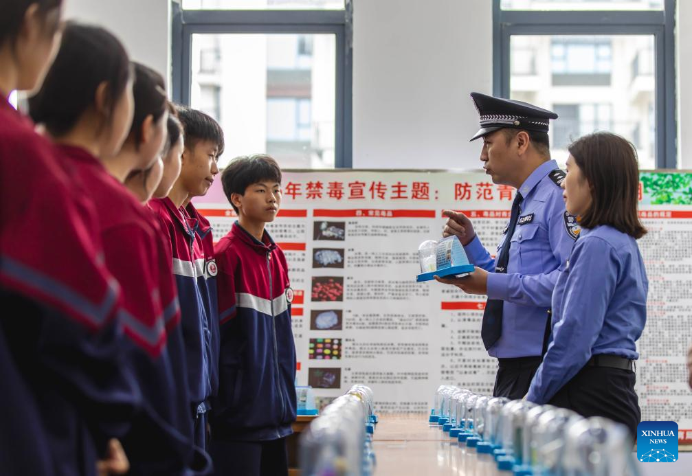 A police officer introduces anti-drug knowledge to students at a school in Qianxi City, southwest China's Guizhou Province, June 26, 2025. This year's June 26 marks the 38th International Day Against Drug Abuse and Illicit Trafficking. Publicity and education activities were held in many places in China to promote the anti-drug awareness. (Photo by Fan Hui/Xinhua)
