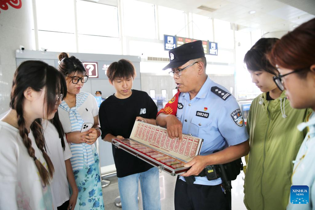 A police officer introduces anti-drug knowledge to passengers at a train station in Lianyungang, east China's Jiangsu Province, June 25, 2025. This year's June 26 marks the 38th International Day Against Drug Abuse and Illicit Trafficking. Publicity and education activities were held in many places in China to promote the anti-drug awareness. (Photo by Wang Chun/Xinhua)