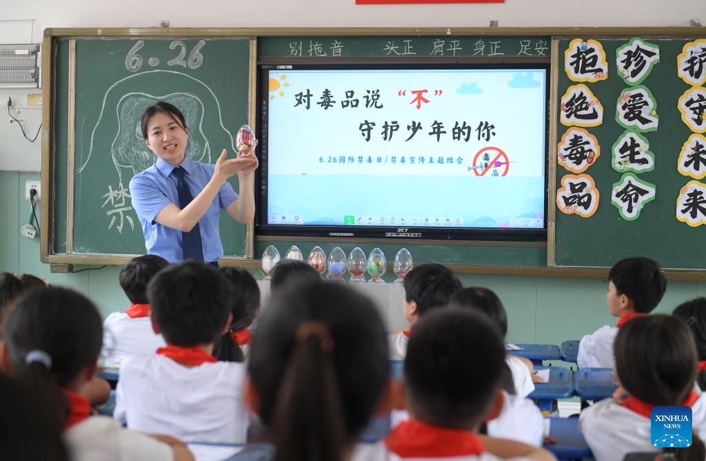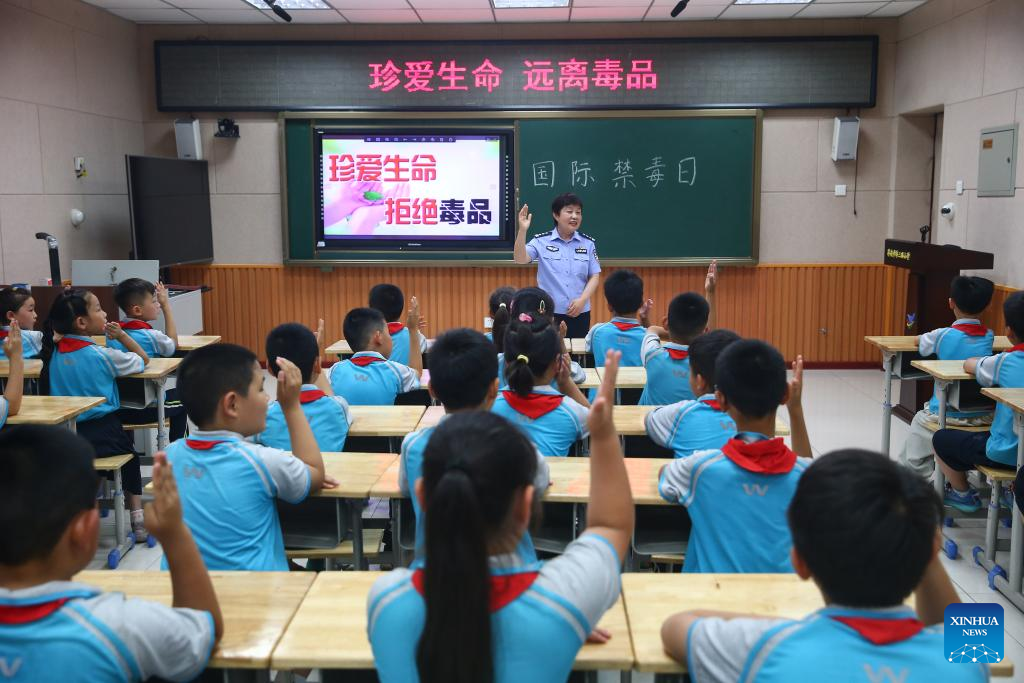 A police officer gives a lecture on drug prevention to pupils at a school in Jinan, east China's Shandong Province, June 25, 2025. This year's June 26 marks the 38th International Day Against Drug Abuse and Illicit Trafficking. Publicity and education activities were held in many places in China to promote the anti-drug awareness. (Photo by Hao Xincheng/Xinhua)