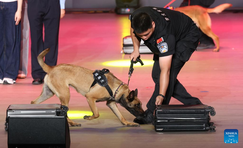 A police officer leads a sniffer dog to search narcotics during a presentation event at a university in Shijiazhuang, north China's Hebei Province, June 26, 2025. This year's June 26 marks the 38th International Day Against Drug Abuse and Illicit Trafficking. Publicity and education activities were held in many places in China to promote the anti-drug awareness. (Photo by Liang Zidong/Xinhua)