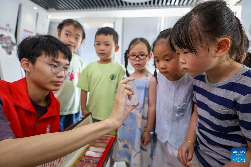 A volunteer introduces anti-drug knowledge to children at a community in Deqing County of Huzhou City, east China's Zhejiang Province, June 26, 2025. This year's June 26 marks the 38th International Day Against Drug Abuse and Illicit Trafficking. Publicity and education activities were held in many places in China to promote the anti-drug awareness. (Photo by Yao Haixiang/Xinhua)
