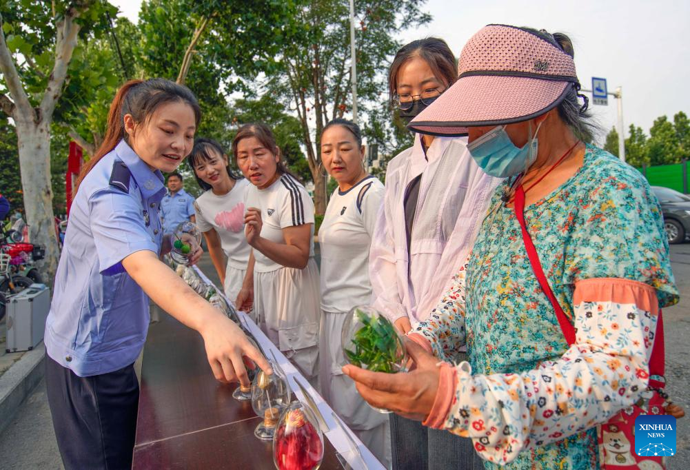A police officer introduces anti-drug knowledge to citizens at a park in Zunhua City, north China's Hebei Province, June 26, 2025. This year's June 26 marks the 38th International Day Against Drug Abuse and Illicit Trafficking. Publicity and education activities were held in many places in China to promote the anti-drug awareness. (Photo by Liu Mancang/Xinhua)