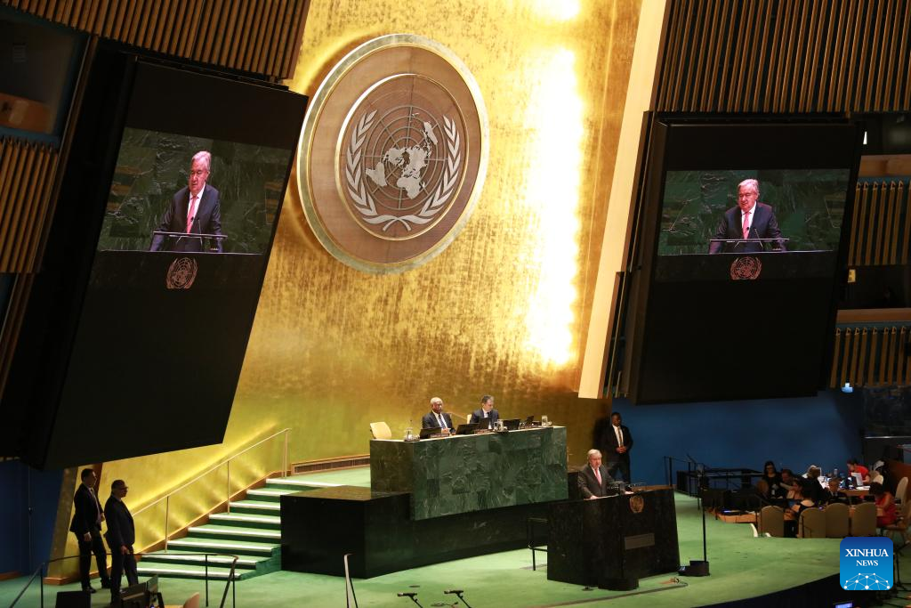 UN Secretary-General Antonio Guterres speaks during a General Assembly event to mark the 80th anniversary of the signing of the UN Charter at the UN headquarters in New York, on June 26, 2025. Guterres on Thursday called out the selective application of the UN Charter, saying it is not an a-la-carte menu. (Xinhua/Xie E)