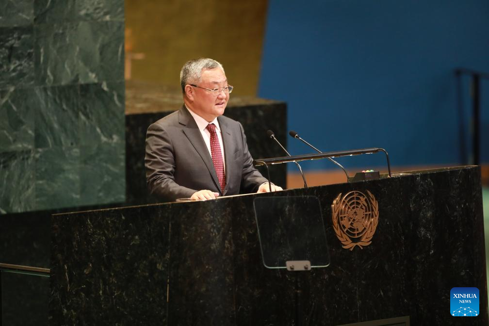 Fu Cong, China's permanent representative to the United Nations, speaks during a General Assembly event to mark the 80th anniversary of the signing of the UN Charter at the UN headquarters in New York, on June 26, 2025. A Chinese envoy on Thursday called for efforts to uphold the international system with the United Nations at its core, on the occasion of the 80th anniversary of the signing of the UN Charter. (Xinhua/Xie E)