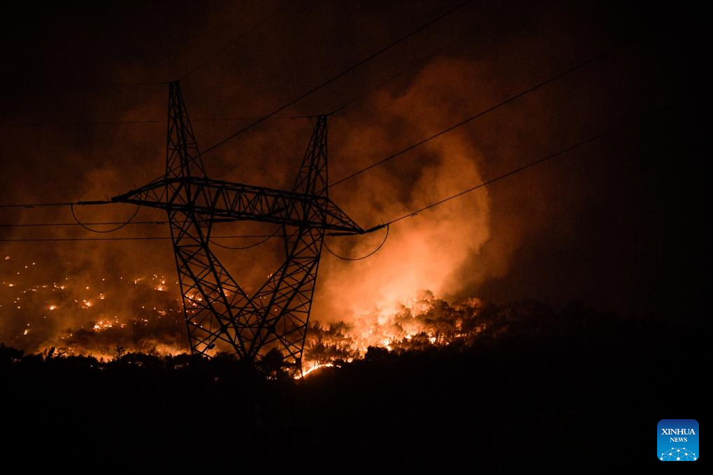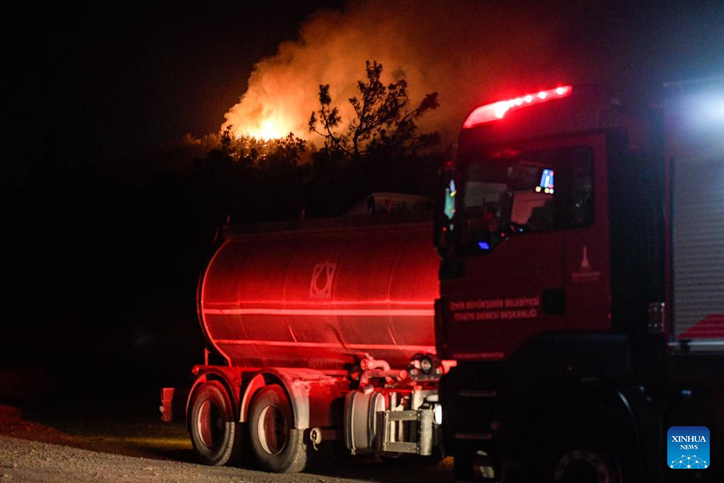 This photo taken on June 26, 2025 shows a forest fire that broke out on Wednesday afternoon in Türkiye's western province of Izmir, with firefighting efforts continuing on Thursday. (Mustafa Kaya/Handout via Xinhua)
