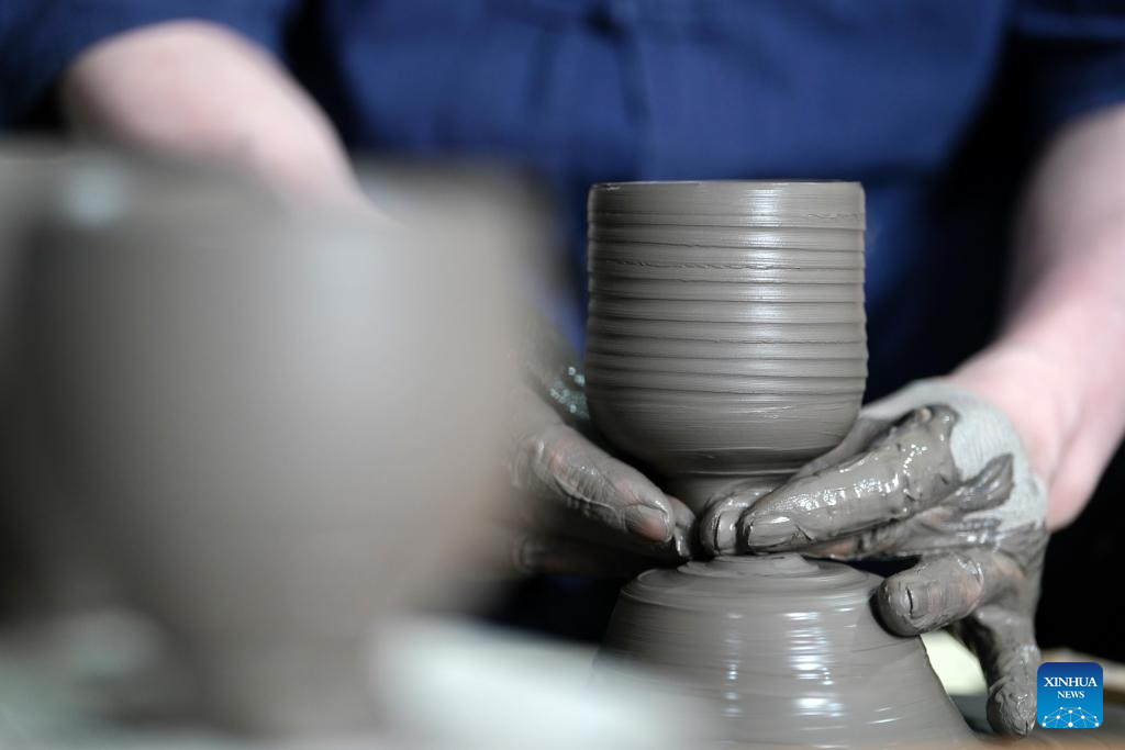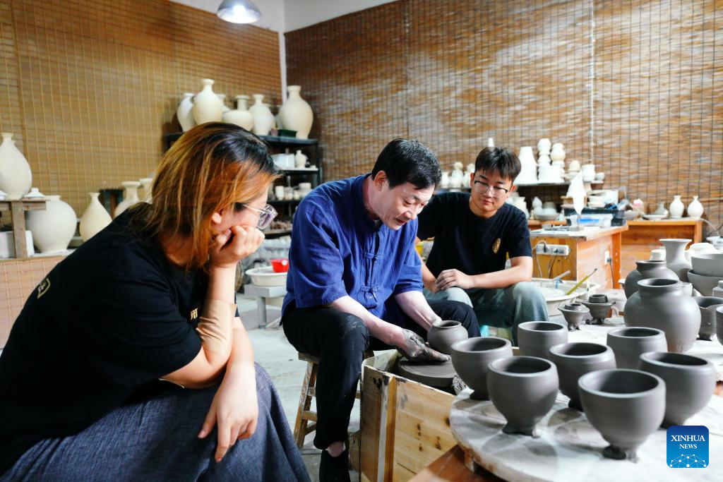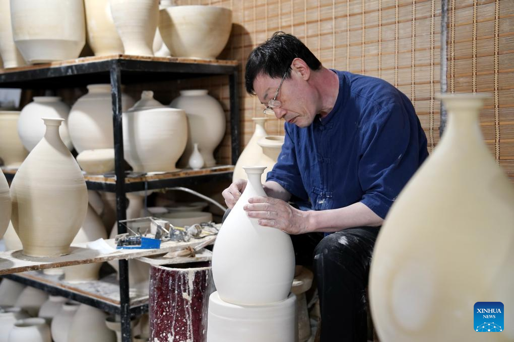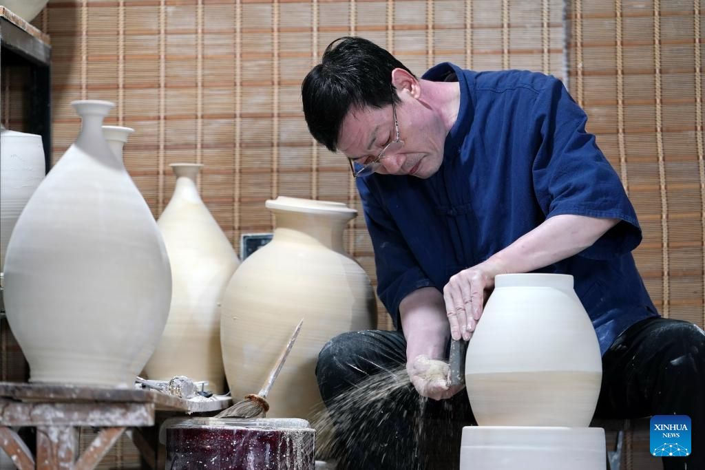 Zhang Zhizhong fixes a ceramic body of a white porcelain work at Xing Klin Culture Exposition Park in Lincheng County, Xingtai, north China's Hebei Province, June 28, 2025. Xing kiln was one of the renowned kilns during the Sui and Tang dynasties (581-907), playing a significant role in the production of white porcelain wares in northern China. The making technique of Xing kiln porcelain was listed as a national intangible cultural heritage in 2014.
