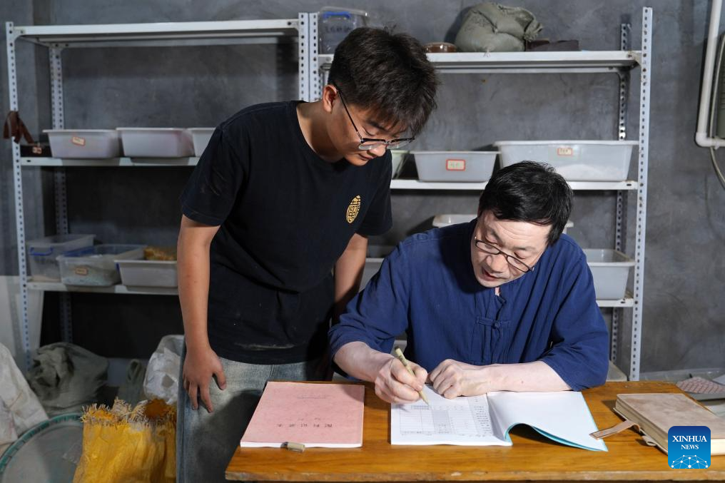Zhang Zhizhong (R) and a student record the raw material formula of white porcelain production at Xing Klin Culture Exposition Park in Lincheng County, Xingtai, north China's Hebei Province, June 28, 2025. (Xinhua/Mu Yu)